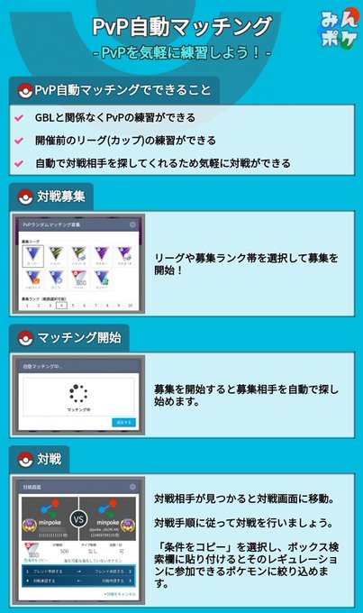 ポケモンgo攻略 みんポケ A Twitteren Pvpの練習相手を簡単に探すことのできる Pvp自動マッチング を公開しました Gbl以外で気軽に練習したい方 今後来るシーズン5の練習がしたい方などにおすすめです T Co L6ynhsekrj ポケモンgo T Co